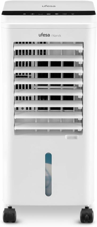 Ufesa Narvik Climatizador Evaporativo, 65W, Función Fría y Ventilador, 3 Velocidades, 3 Modos, Panel Táctil, Depósito 5L, Temporizador 12h, Filtro Lavable, 2 Bloques de Hielo, Mando a Distancia.