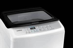 LAVADORA AUTOMATICA, DE 9. KG DE CAPACIDAD, PANTALLA DIGITAL.COLOR BLANCO, ACERO INOXIDABLE , MARCA SAMSUNG WOBBLE . ESTA LAVADORA LAVA Y CENTRIFUGA. PERO NO SECA AL VAPOR, TIENE TAMBOR EN LA PARTE SUPERIOR, 110 VOLT
